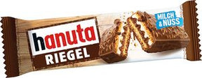 The hanuta bar (34.5g) combines the popular hazelnut flavor with an extra crunch. It consists of milk and hazelnut cream, crispy wafers, and a layer of milk chocolate with crunchy hazelnut pieces. The perfect snack for on the go.